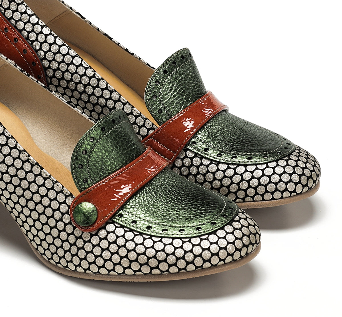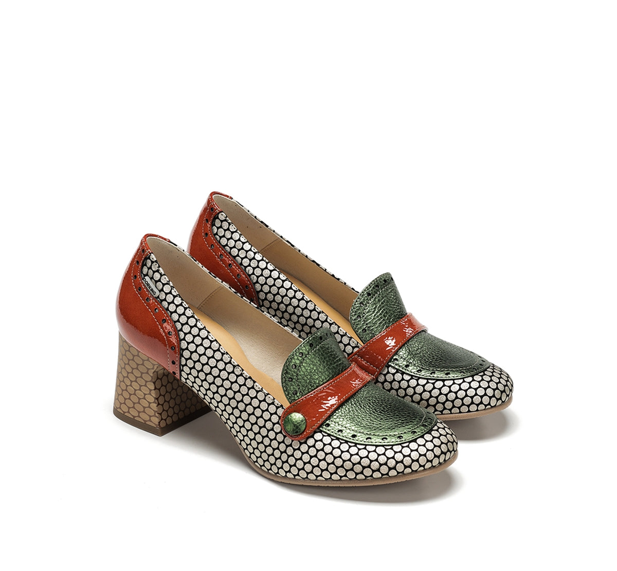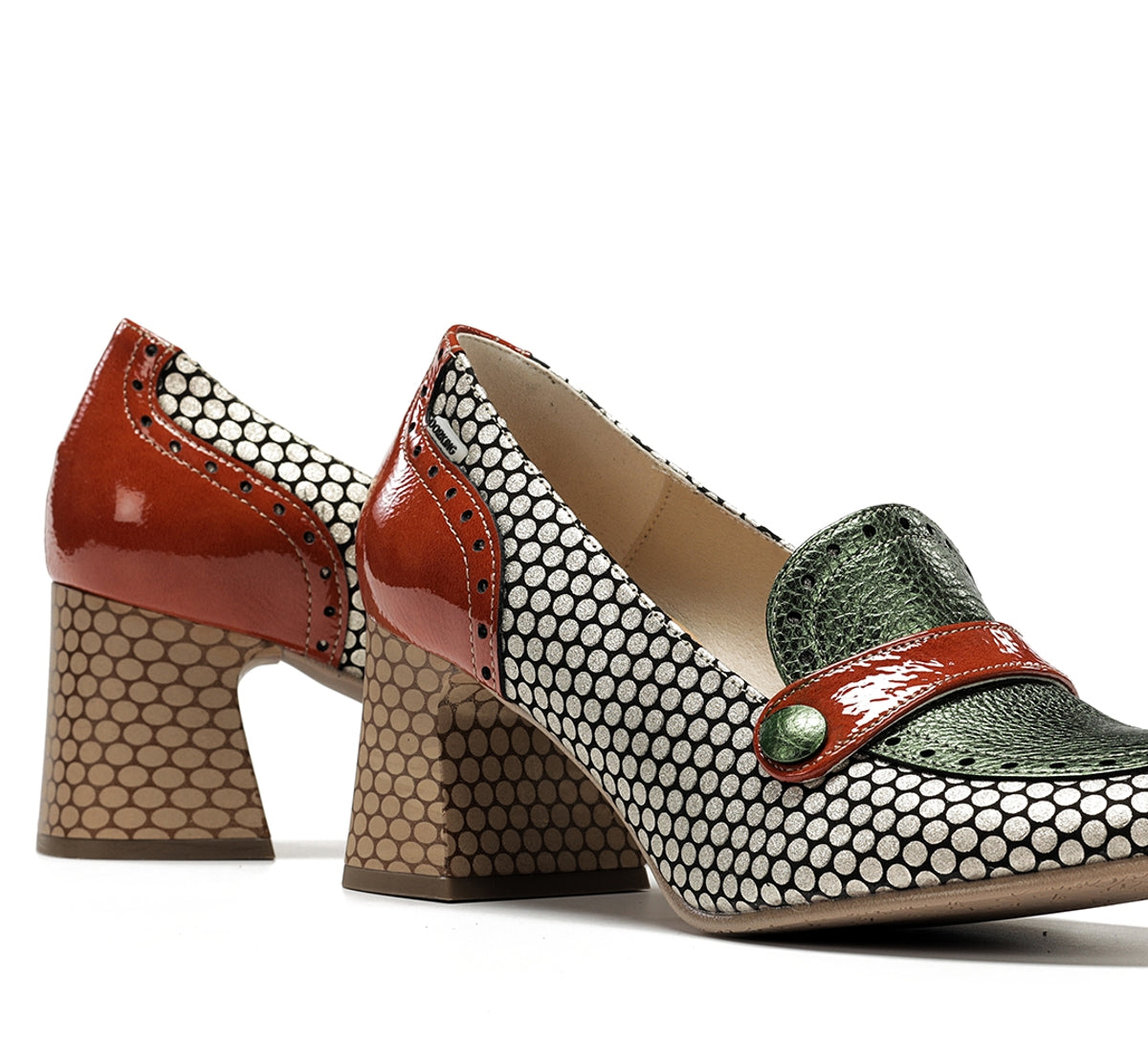 Daci stands out for its bold character and design full of personality. Available in versions with laces, a buckle, or an easy fit, it adapts to every style and occasion. Its geometric heel provides stability and a distinctive touch, while the mix of colours and textures conveys creative elegance. A model designed for women who like to stand out with their own unique style.